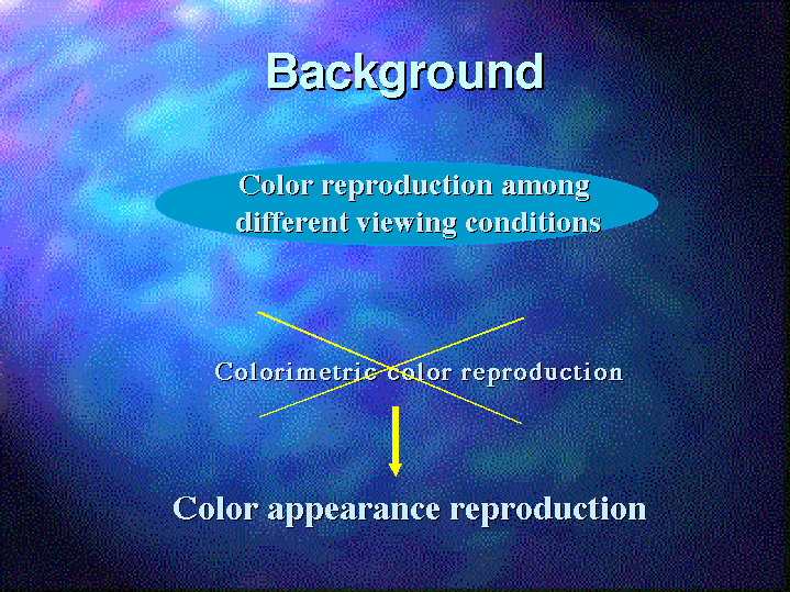 If the original and the reproduction image are observed in a same viewing condition, colorimetric color reproduction is very useful and gives you same color appearance between the original and the reproduction. But, if the reproduction image is presented in the different media and in the different viewing condition from the original image, colorimetric reproduction gives you unsatisfied results. In this case, it needs a color-appearance reproduction.