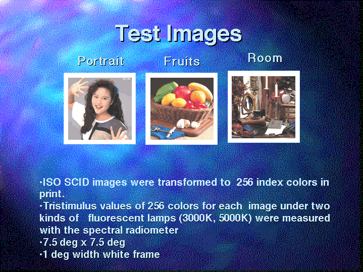 These three pictures were used for the test images. The ISO SCID image data were transformed to 256 index colors, then they were printed with the ink-jet type printer. Then, tristimulus values of 256 colors of each image under two kinds of fluorescent lamp, 3000K and 5000K, were measured with a a spectral radiometer.