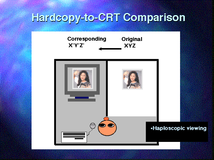 The experiment was done with the haploscopic viewing condition. In the hardcopy-to-CRT comparison, the original print were set in right eye viewing booth, and the reproduction image predicted by each model was in the CRT display in the left eye viewing booth.