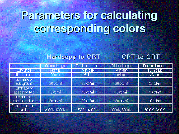 In the hardcopy-to-CRT comparison , a surround condition of prints is normal. They were illuminated by 200 lux of 3000K or 5000K fluorescent lamp, luminance of adapting field is 6 cd/m2 and the luminance of the reference white is 30 cd/m2. The original image was compared with the reproduction image displayed on the CRT set in the dark. The background luminance is same to the original. And the luminance of adapting field was 16 cd/m2, the luminance of the reference white is 80 cd/m2, and the correlated color temperature is 6500K or 9300K.