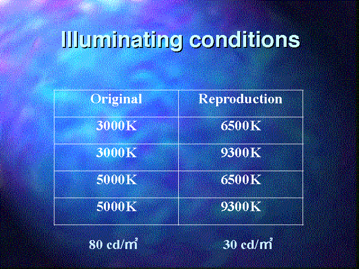 The white point of the original image was either 3000K or 5000K, and its luminance was 80 cd/m2. The white of the reproduction was either 6500K or 9300K, and its luminance was 30 cd/m2, it is lower than the original image.