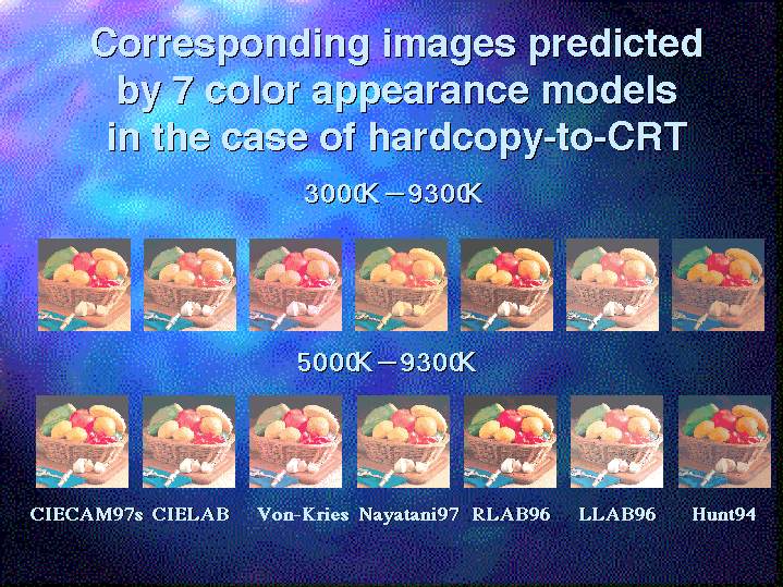 This figure shows the corresponding images predicted by 7 color appearance models in the case of hardcopy-to-CRT comparison. The upper series show the images under 6500K illuminant which are supposed to appear the same color to the original image under 3000K. The lower series show the 9300K image which would appear the same color to the original image under 5000K. Although these colors are different from the color displayed in the calibrated CRT monitor, you can see the difference among the models.