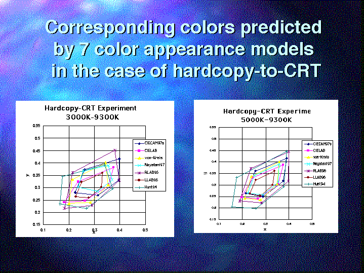 This figure shows the corresponding colors predicted by each color appearance models for 5 Munsell color chips. The left figure shows the case that the original has 5000K white point and the reproduction has 9300K white point. You can see a large difference among models. In the case of 5000K original and 9300K reproduction, also show the difference among models.