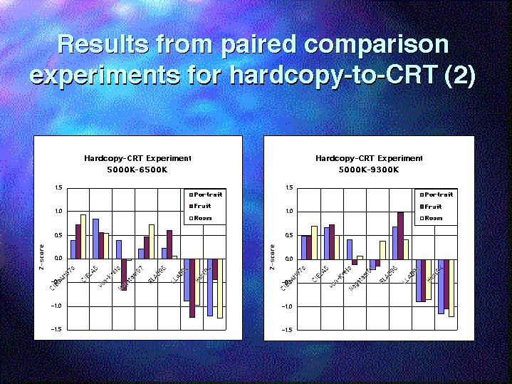 This is in the case of 5000K white point used for the original image. Again, CIECAM and RLAB show good performance. In this case, the CIELAB also shows a good prediction.