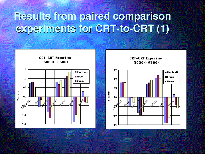 This graph shows the results from the CRT-to-CRT comparison. In this case, RLAB shows the best performance, and CIECAM is also good. CIELAB shows poor performance in the CRT-CRT comparison.