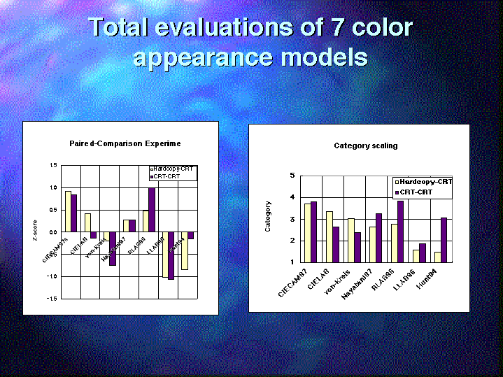 This shows the total evaluation of 7 color appearance models. These scores and the categories are derived from the mean values of all illuminant conditions and for all pictures. The paired comparison and the category scaling show similar results.